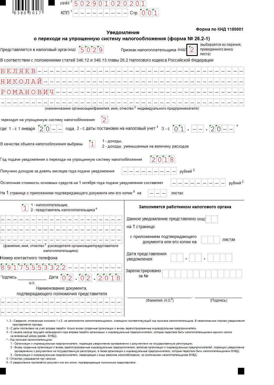 Оставшуюся часть бланка заполняет работник налогового органа. Форма № 26- 2.1 составляется в двух экземплярах. Один возвращают налогоплательщику с подписью и печатью ИФНС. Это подтверждение того, что вы сообщили в налоговый орган о своем намерении перейти на упрощенку со следующего года.