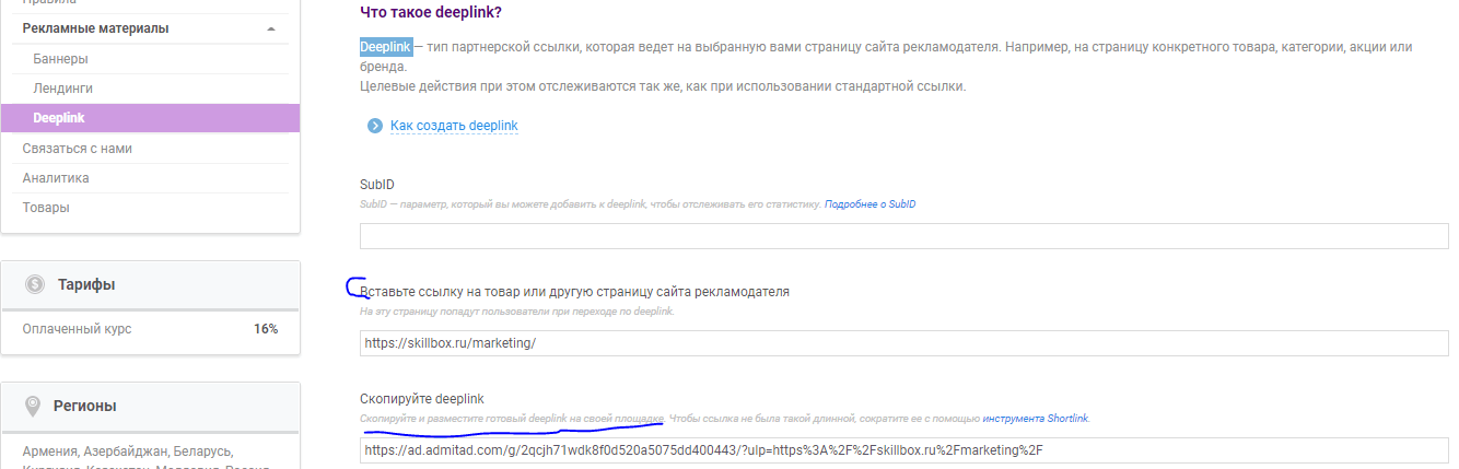 - Партнерская ссылка – генерируется для сайта в целом, ведет непосредственно на главную страницу. Размещать ее можно как на собственном ресурсе, так и под постами, в комментариях и где угодно еще. Если пользователь купит товар в течение месяца после перехода по ней, то вознаграждение будет вам засчитано.