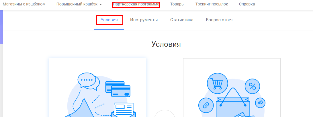 Шаг 1. В верхней части стартовой страницы найдите вкладку Партнерская программа и перейдите в соответствующий раздел, как в инструкции выше. Там найдите вкладку Условия и откройте ее.