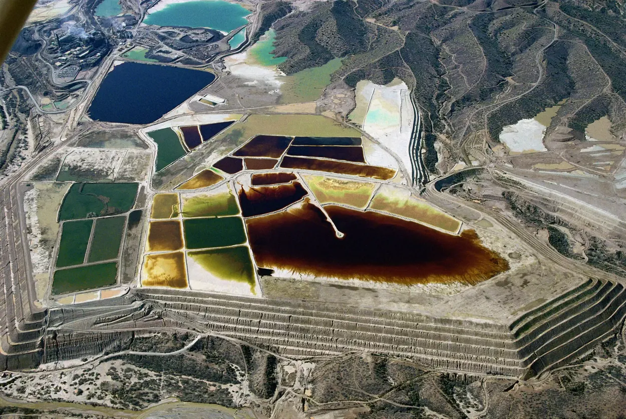 Цветные лужи воды содержат медные хвосты – пустую породу, из которой удалили медную руду после добычи в Кирни, штат Аризона, США. Джеральд Френч / Getty Images