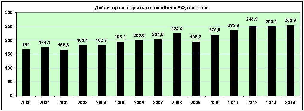 Добыча угля карьерным методом составляет 65 % от общего объема угледобычи, и доля его имеет тенденцию постепенно увеличиваться. За будущее десятилетие она предположительно повысится еще на 10 %. В РФ угледобыча таким способом возросла со 167 до 253,9 тонн за период с 2000 до 2014 года.