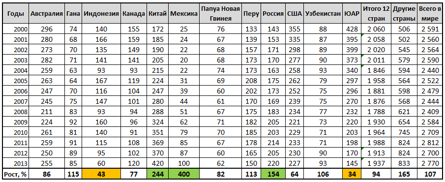 Общий мировой объем добычи золота составляет 2200 тонн.
