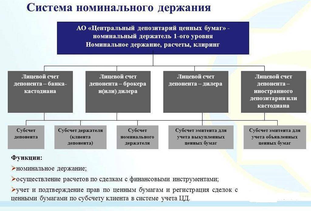Благодаря схеме номинального держания в реестре акционеров будет указан не фактический владелец, а номинальный держатель ценных бумаг. В ряде случаев номинальным держателем в реестре акционеров может выступать только центральный депозитарий, которым в России является НКО ЗАО «Национальный расчётный депозитарий», относящийся к группе компании «Московская Биржа». НКО ЗАО «НРД» работает как депозитарий с организациями, которые осуществляют профессиональную деятельность на рынке ценных бумаг и имеют лицензии. В частности, НРД открывает депозитариям счета номинального держателя. Владелец ценных бумаг может открыть счёт в депозитарии «Х». Ценные бумаги будут находится под двойным номинальным держанием. В результате ни реестродержатель, ни первичный номинальный держатель, на счетах которого будут учитывать ценные бумаги в реестре, не будут знать фактического владельца.