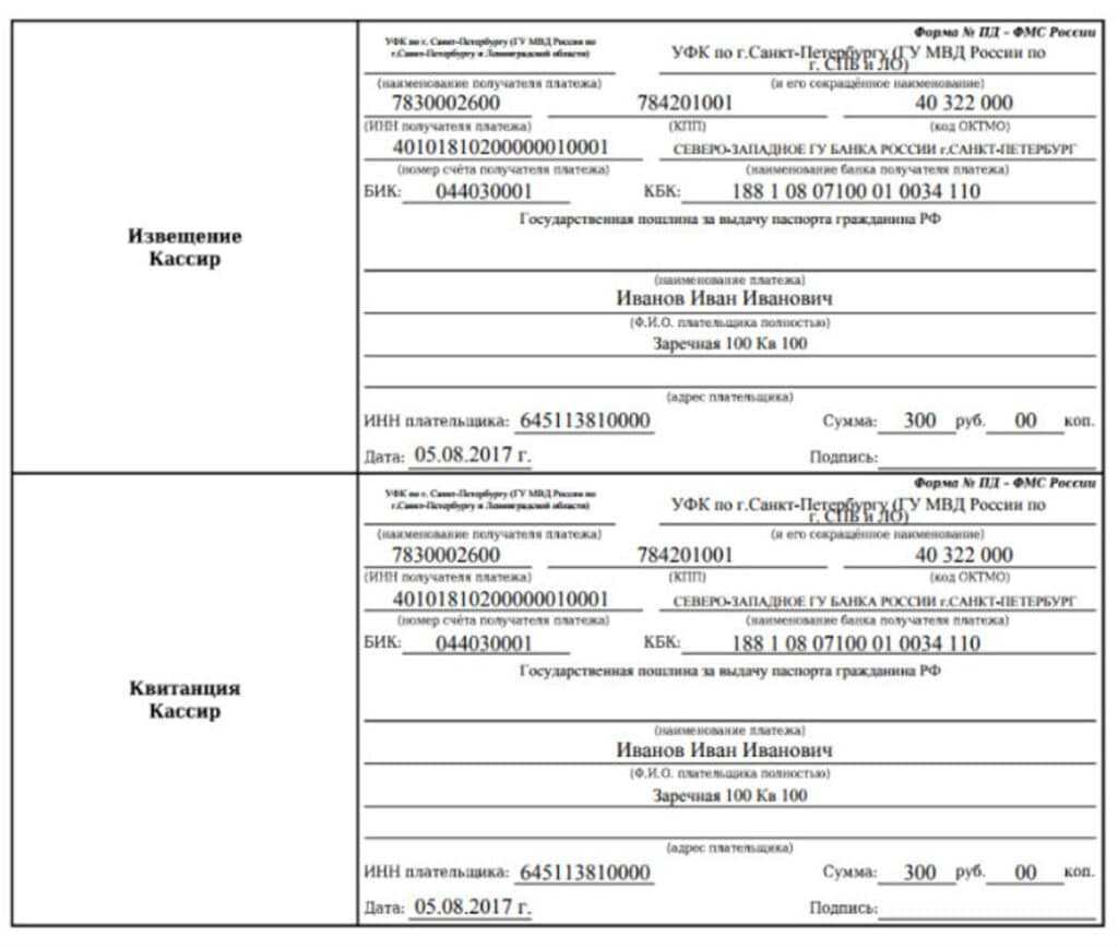 Обе части квитанции заполняются одинаково. Когда вся требуемая информация будет указана, бланк можно смело отдать кассиру для проведения соответствующей операции. После внесения денежных средств и проведения платежа, на руки плательщику выдаётся чек. Данные, указанные в этом документе, следует проверить с особой тщательностью. При наличии некорректной информации, денежные средства будут перечислены на другой счёт и гражданину откажут в приёме бумаг на замену паспорта.
