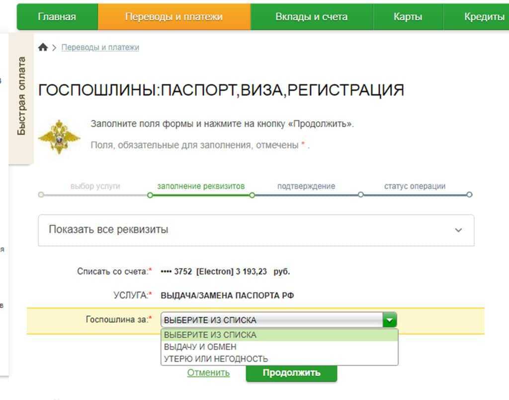 Сумма госпошлины (300 или 1500 руб.) также подставляется автоматически (в зависимости от указанного основания выдачи или замены паспорта).