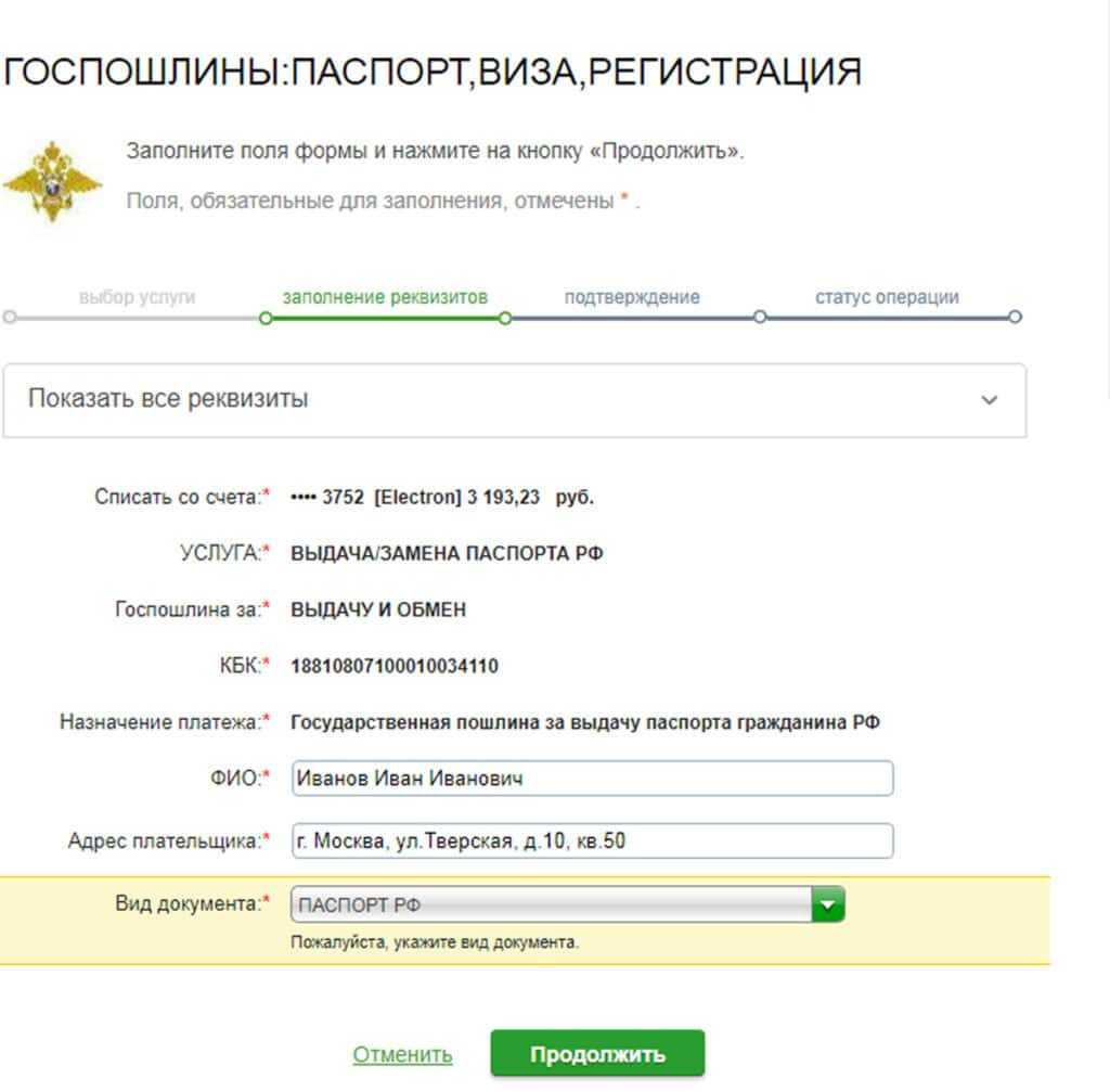 В деталях платежа указываете личные данные заявителя (Ф.И.О. и адрес) и выбираете вид документа, удостоверяющего личность.