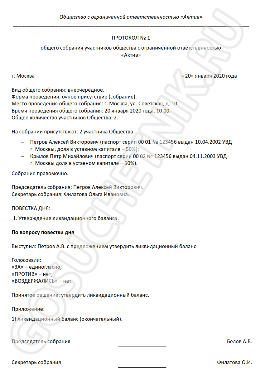 Утверждением занимаются те лица, которые инициировали ликвидацию. Решение и протокол об утверждении баланса — это два разных документа. Решение об утверждении составляется, если у компании единственный учредитель (или в фирме числится лишь один участник). Протокол утверждения готовится по итогам общего собрания участников ООО. По сути, протокол — это совместное определение всех участников компании об утверждении документов ликвидации.