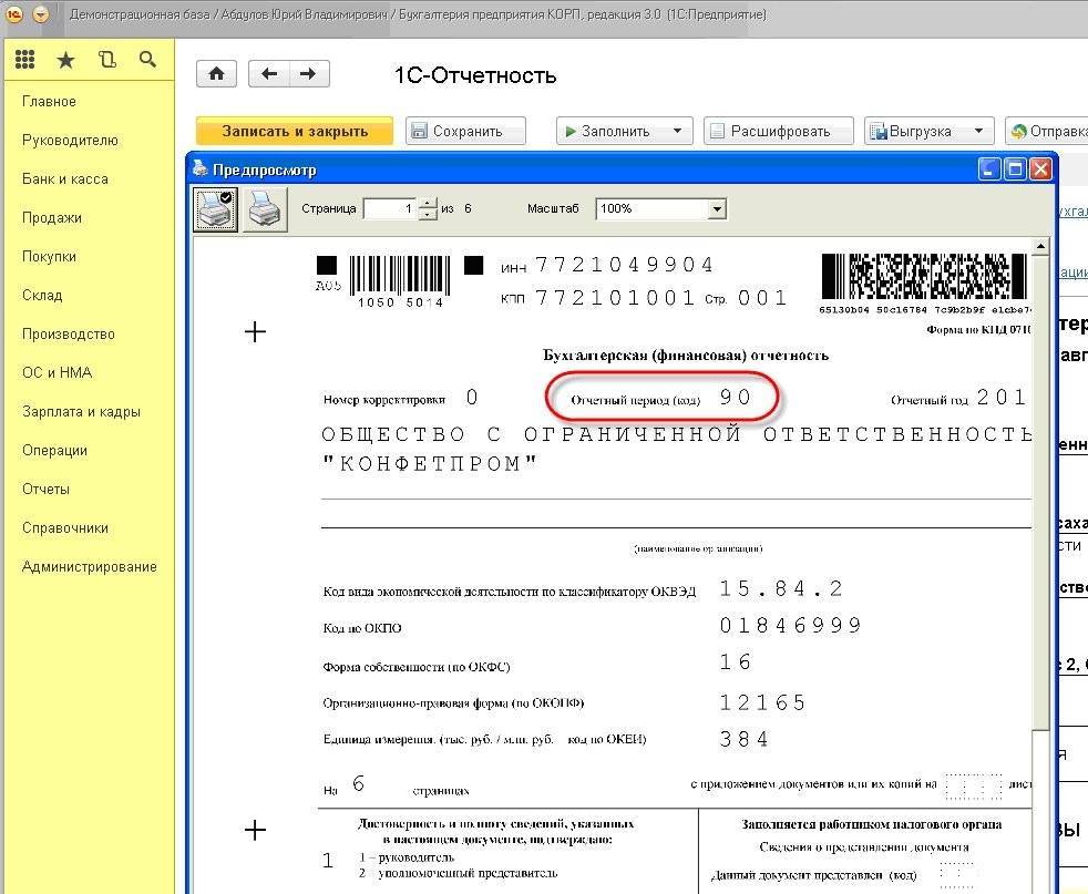 На таком бланке в поле Отчетный период (код) проставляется код 90 или 94 в зависимости от вида сформированной бухгалтерской (финансовой) отчетности (рис. 5).