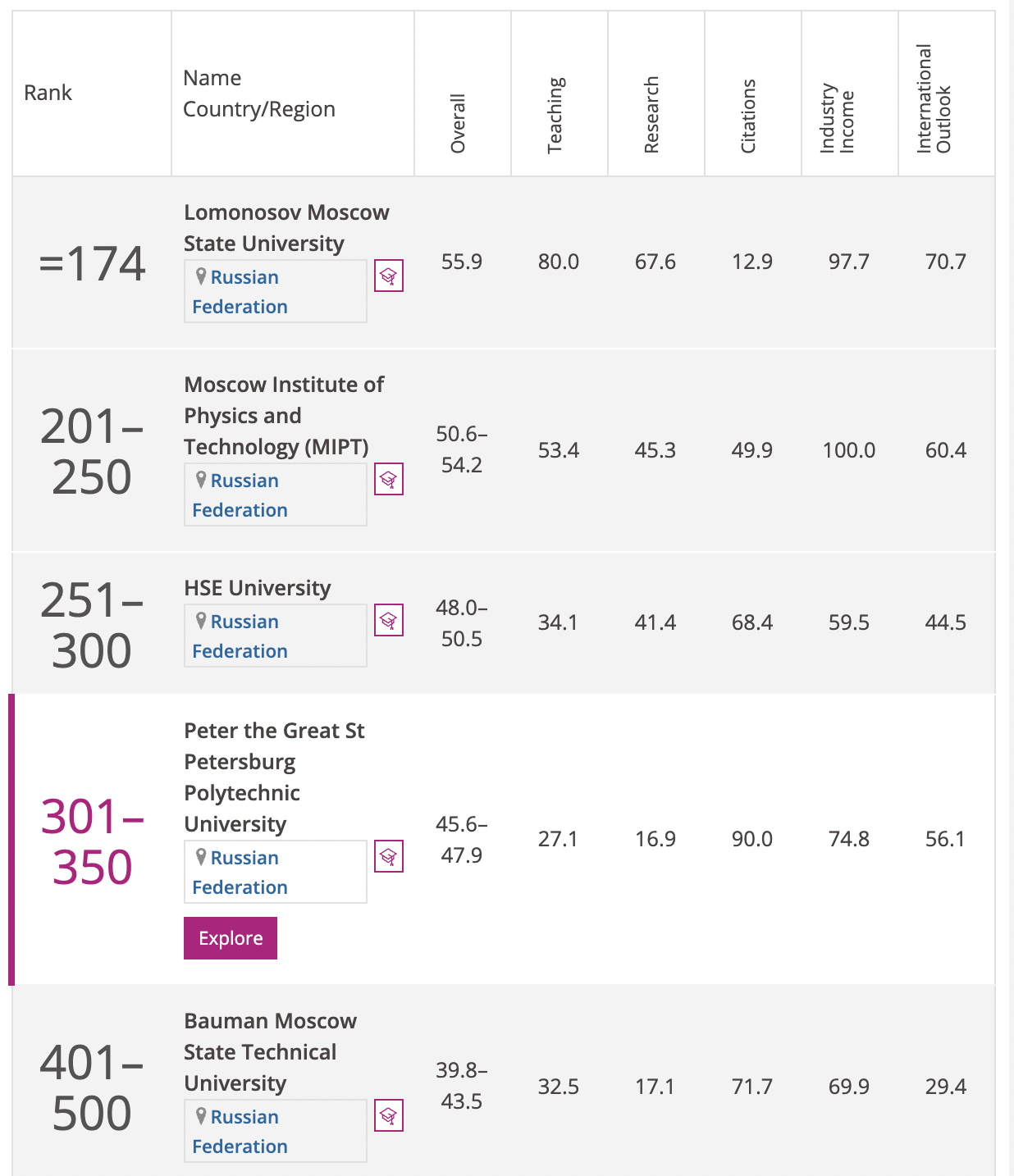 ежегодно публикует британский журнал Times Higher Education (THE). В рейтинг включают более 1600 вузов из 99 стран мира.