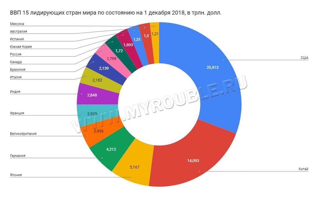 По итогам 2018 года, РФ не удалось войти в ТОП-10 стран с наивысшим показателем ВВП, заняв лишь 11 позицию.