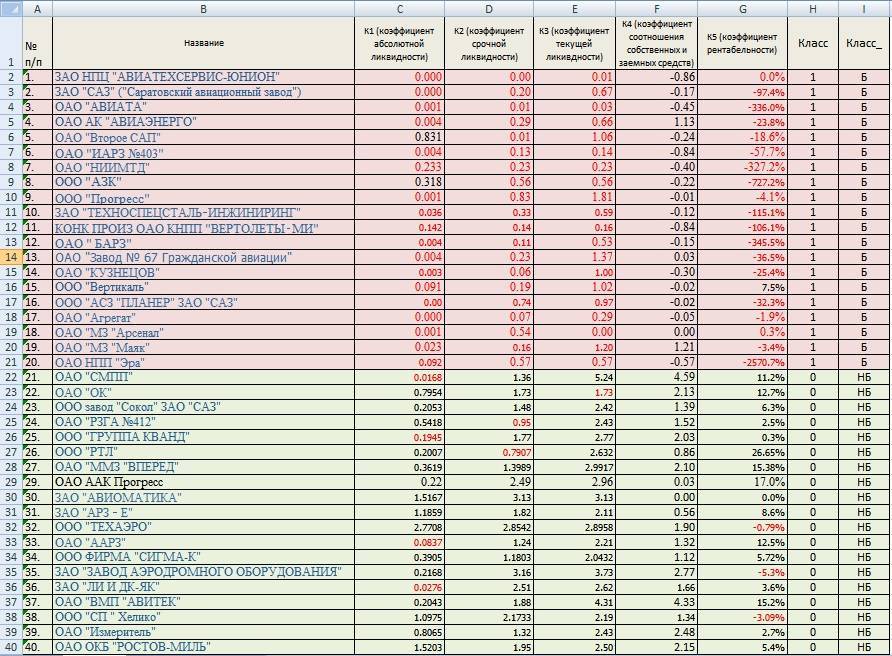 В таблице Excel представлены названия авиационных предприятий, их финансовые коэффициенты и принадлежность к одному из классов (1 – банкрот, 0 – не банкрот).