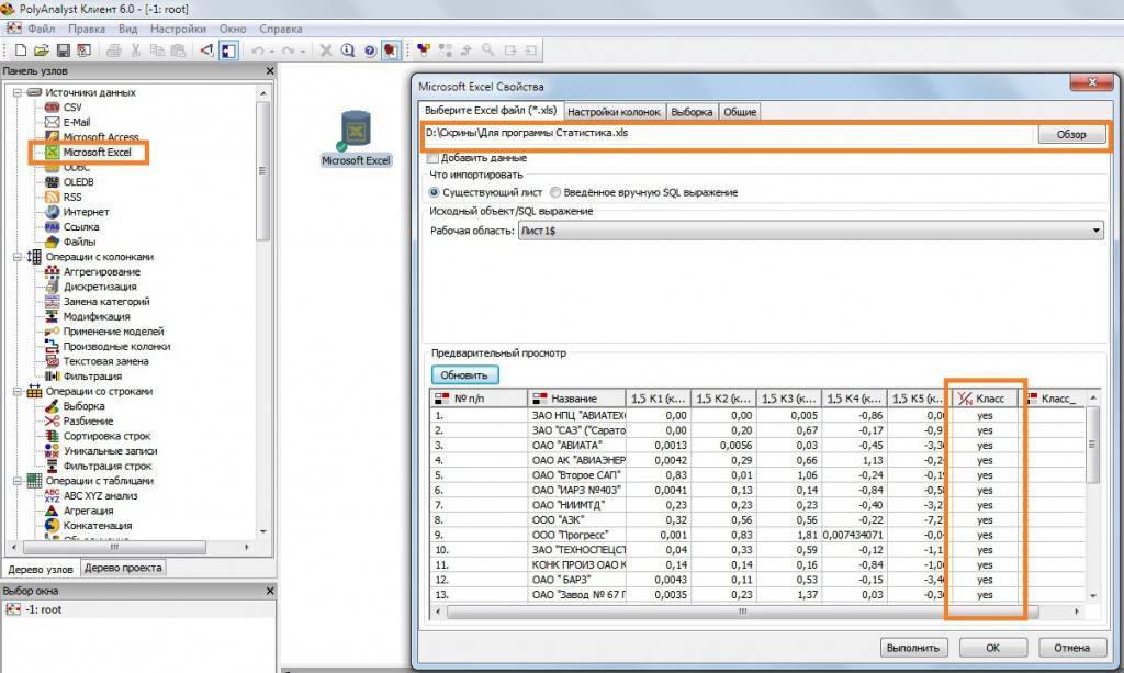 На следующем этапе необходимо подключить в статистической программе PolyAnalyst базу данных по предприятиям двух классов. Для этого в разделе «Панель узлов» выбираем вкладку «Источник данных» → «Microsoft Excel». Перетаскиваем данный узел на лист и открываем его. В появившемся окне выбираем адрес базы данных по предприятиям. Следует заметить, что необходимо установить класс «Да/Нет» для колонки с 1/0. Для этого необходимо перейти во вкладку «Настройка колонок» → «Тип колонок». Итак все основные приготовления с базой данных сделаны.
