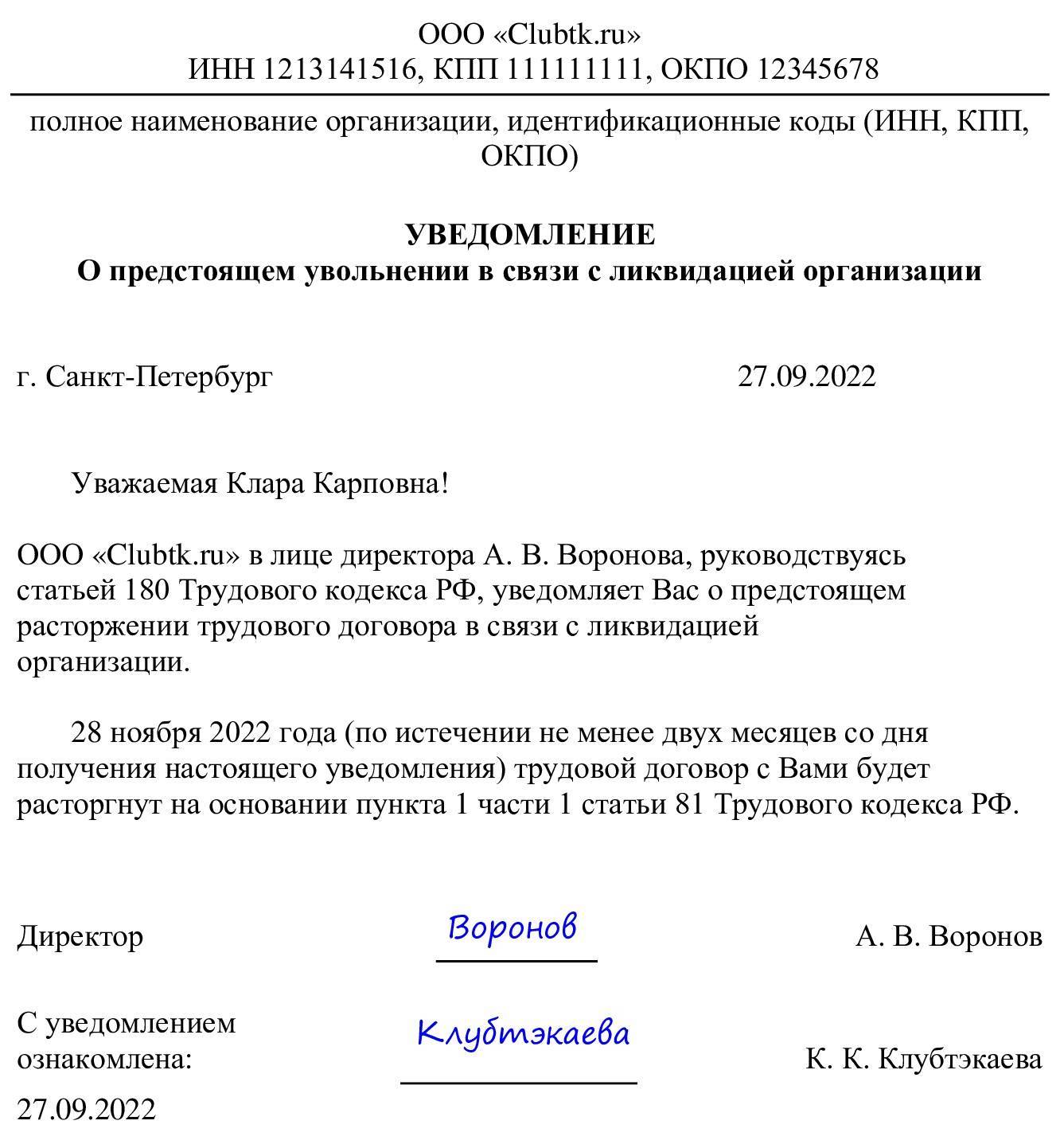 ✓ уведомить сотрудников о прекращении деятельности фирмы за два месяца, при этом последние должны расписаться, что с информацией ознакомлены и в курсе процесса ликвидации;