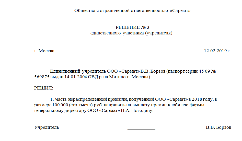 Как правило, решение о назначении премии сотрудникам к юбилею принимается без возражений. Каждый сотрудник хочет доработать в организации до такого момента. При поощрении директора образец для составления решения можно взять такой:
