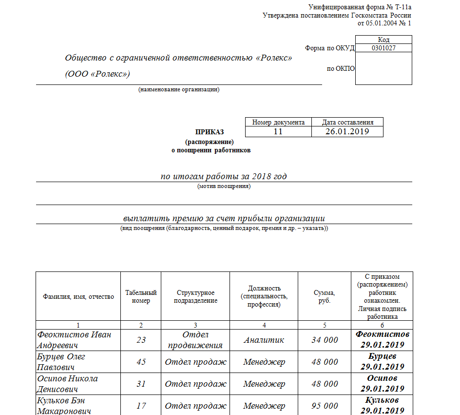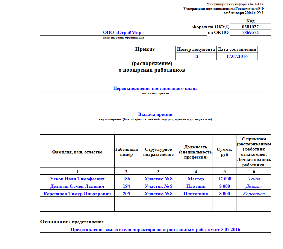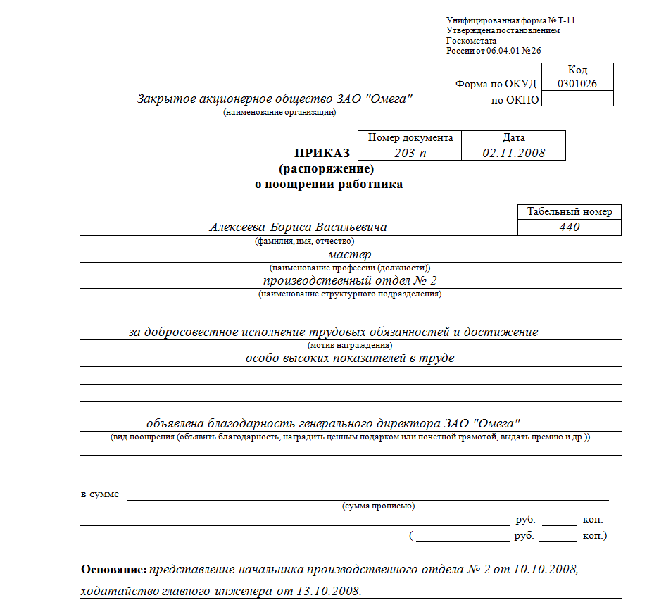 Для приказа о премировании сотрудника образец используется в виде заполненной формы Т-11.