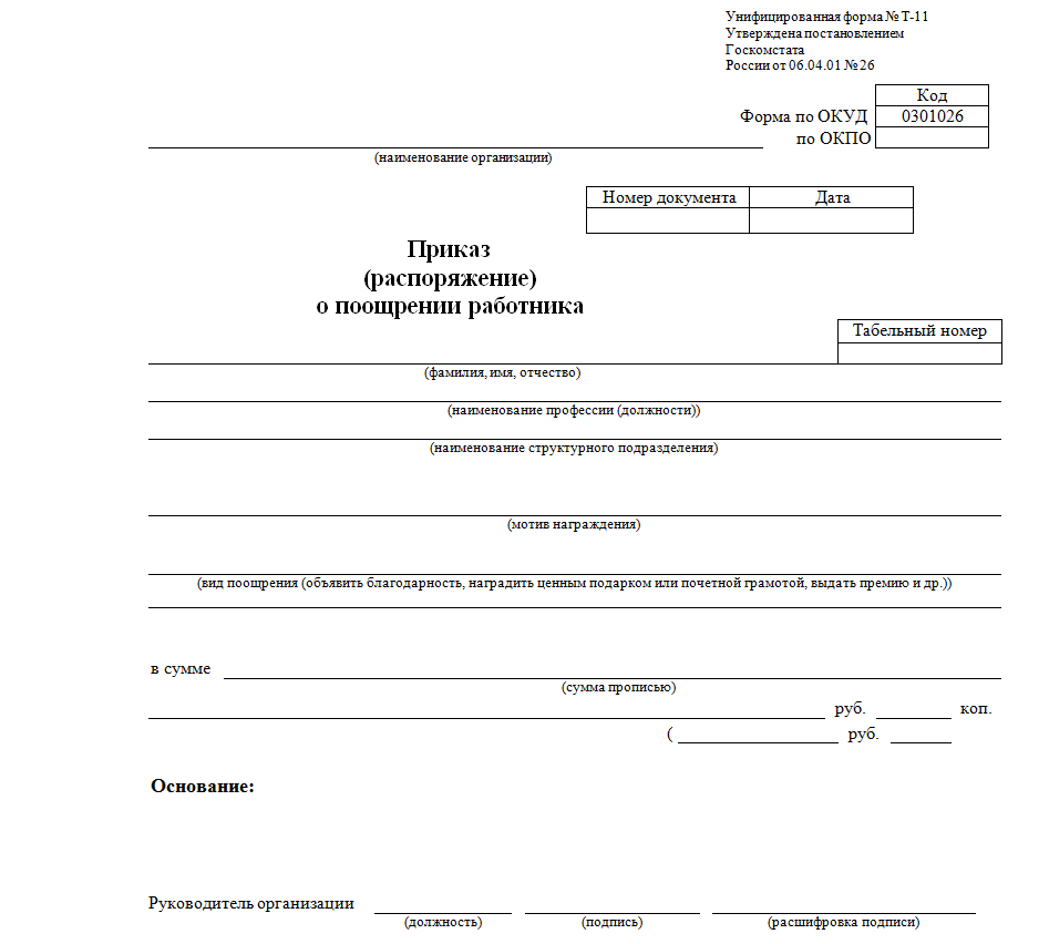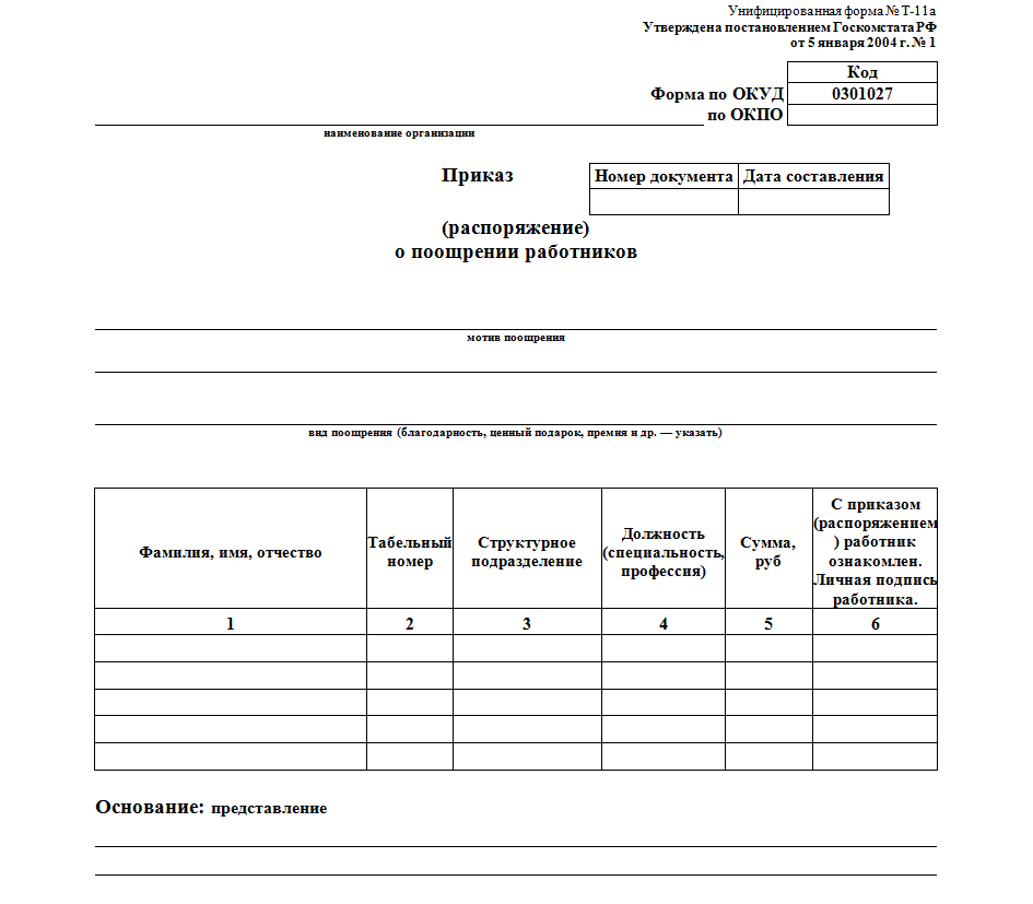 Приказ о поощрении составляется согласно типовым формам. Так, распоряжение о награждении денежной премией, в зависимости от количества поощряемых лиц, выдаётся на бланке Т-11 или Т-11а.