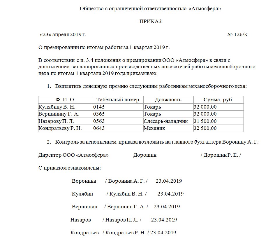 Приказ о премировании сотрудников — образец 2019 — 2020