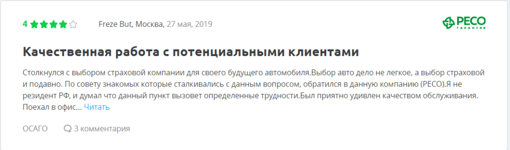 - РЕСО Гарантия предоставляет для клиентов сниженные базовые ставки, что уже отражается на цене в меньшую сторону. Также преимуществом компании является сотрудничество с большим количеством станций техобслуживания. Благодаря этому клиенты своевременно отправляются на ремонт.
