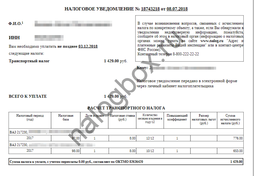 В уведомлении должны быть указаны: размер налога, расчет налоговой базы, срок уплаты налога. В этот же конверт для удобства налогоплательщика вкладывают уже заполненную квитанцию.