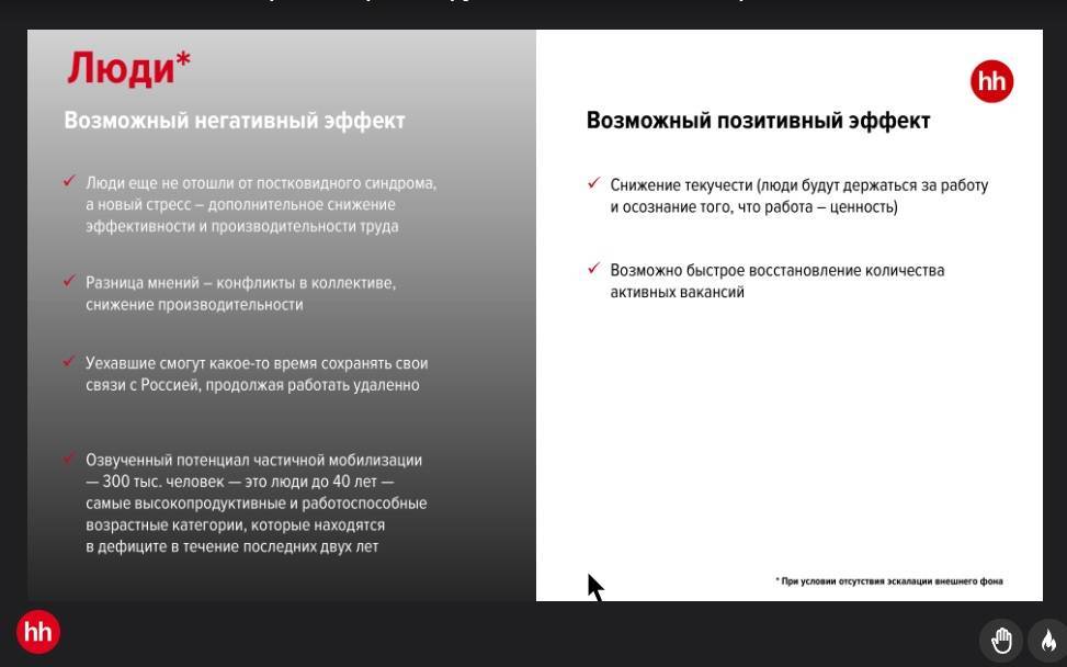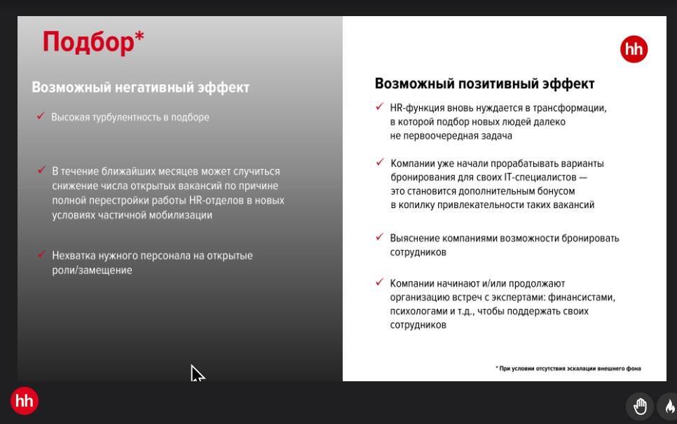 Для кадровиков работа становится еще более сложной в том плане, что дозваниваться до кандидатов стало сложнее, а их поведение — еще менее предсказуемым. Значительно больше внимания у кадровых служб стало уделяться оформлению кандидатов с учетом требований по призыву и оформления брони от него. Компании, которые предлагают бронь, стали более привлекательны для кандидатов.