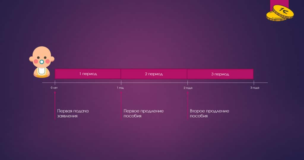 При обращении за выплатой ее назначают по особым правилам: в первый раз до момента, когда ребенку исполнится год. Потом – оно продлевается до момента, когда ребенку исполняется 2 года, а затем – и на третий год (то есть, до трёхлетнего возраста ребенка).