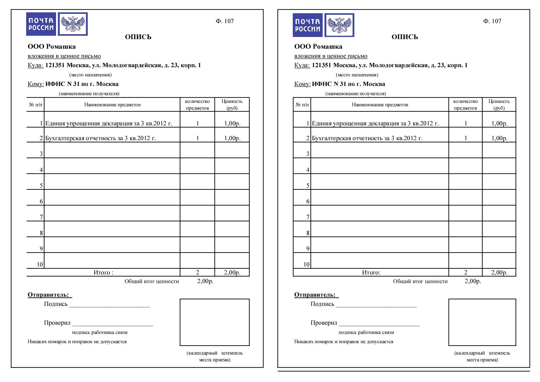 Для этого выдается 2 бланка описи вложения, которые соответствуют утвержденной форме Ф-107. Опись составляется отправителем, почтовый оператор проставляет печати, отправитель получает первый экземпляр, а второй бланк прикладывается к заказному отправлению.
