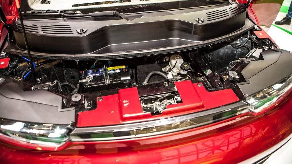 Помимо тесного салона еще один минус длины кузова в 3400 мм — багажник «для галочки» — туда поместятся разве что пара дорожных сумок или пакетов из продуктового. Ну и кабель зарядки, само собой. Под капотом, как например у Tesla, дополнительного багажника тоже нет — там у Кама-1 пусковой аккумулятор, вакуумный усилитель тормозов и так далее — все выглядит почти как у обычного переднеприводного автомобиля.