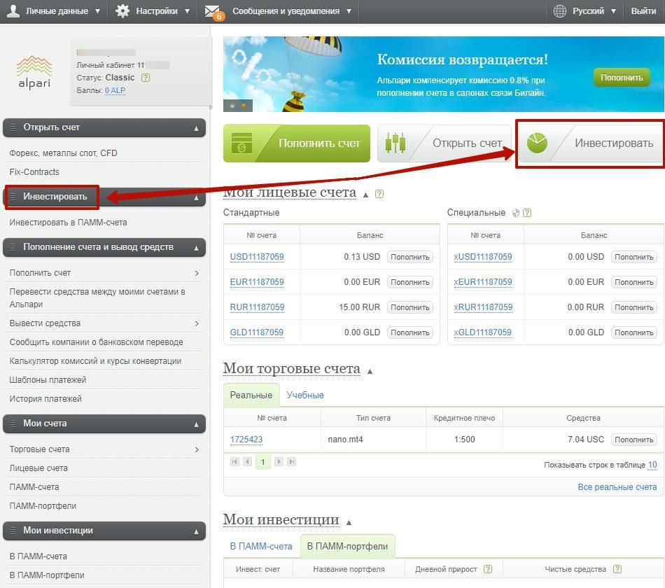 После того, как вы выбрали себе Форекс-брокера, зарегистрировались и вошли в личный кабинет, нужно перейти в раздел “Инвестирование в ПАММ-счета”. Название разделов может быть другим, все зависит от того, какого брокера вы выберите.