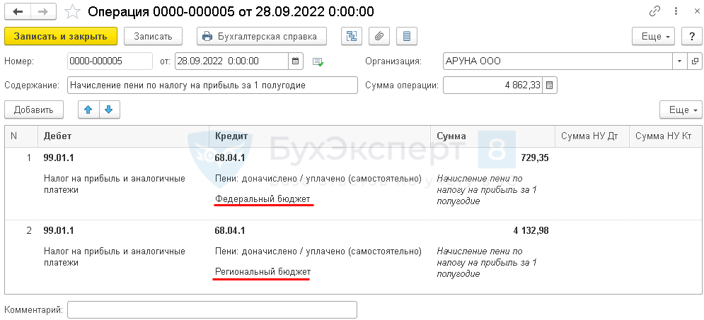 - Субконто 1 — Вид платежа в бюджет — Пени: доначислено / уплачено (самостоятельно);