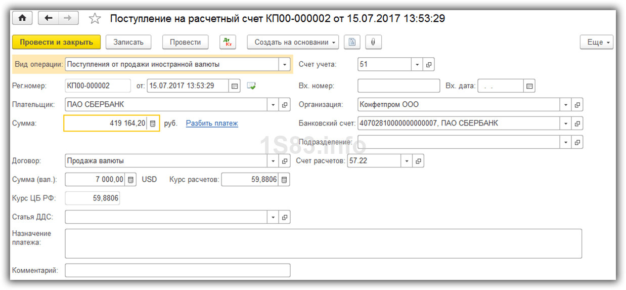 После получения банком 7000$, он переведет нам ее в рублевом эквиваленте. В программе учитывается документом .