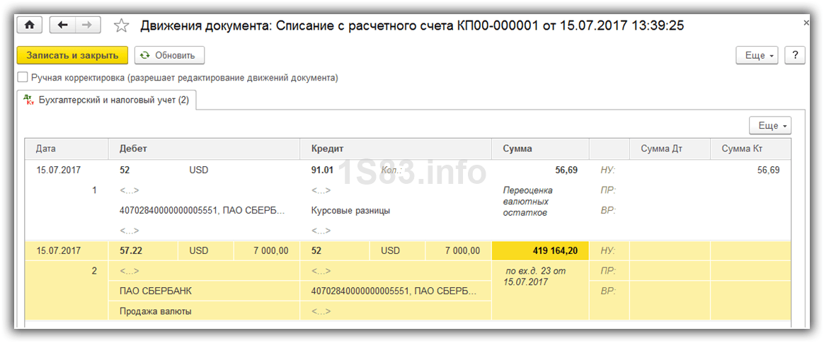Проведем документ и рассмотрим его проводки. Вы можете увидеть, что отразилось не только само списание, но и курсовые разницы.