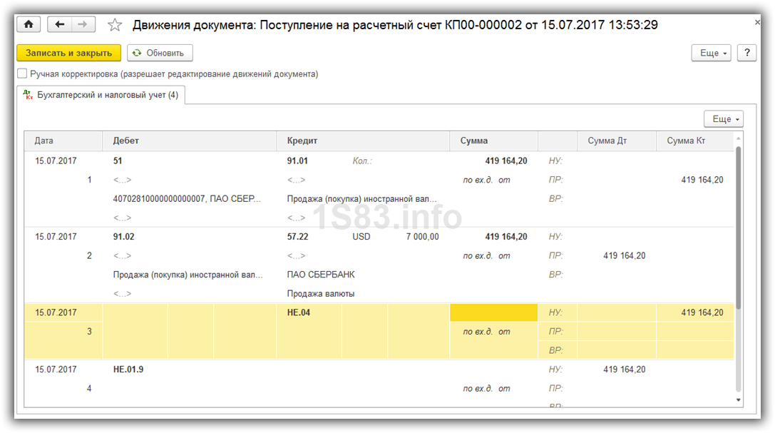В случае, если валюта изменила свою стоимость с момента последней валютной операции, в 1С добавится еще и проводка по расчету переоценки валютных остатков (если переоценка настроена).