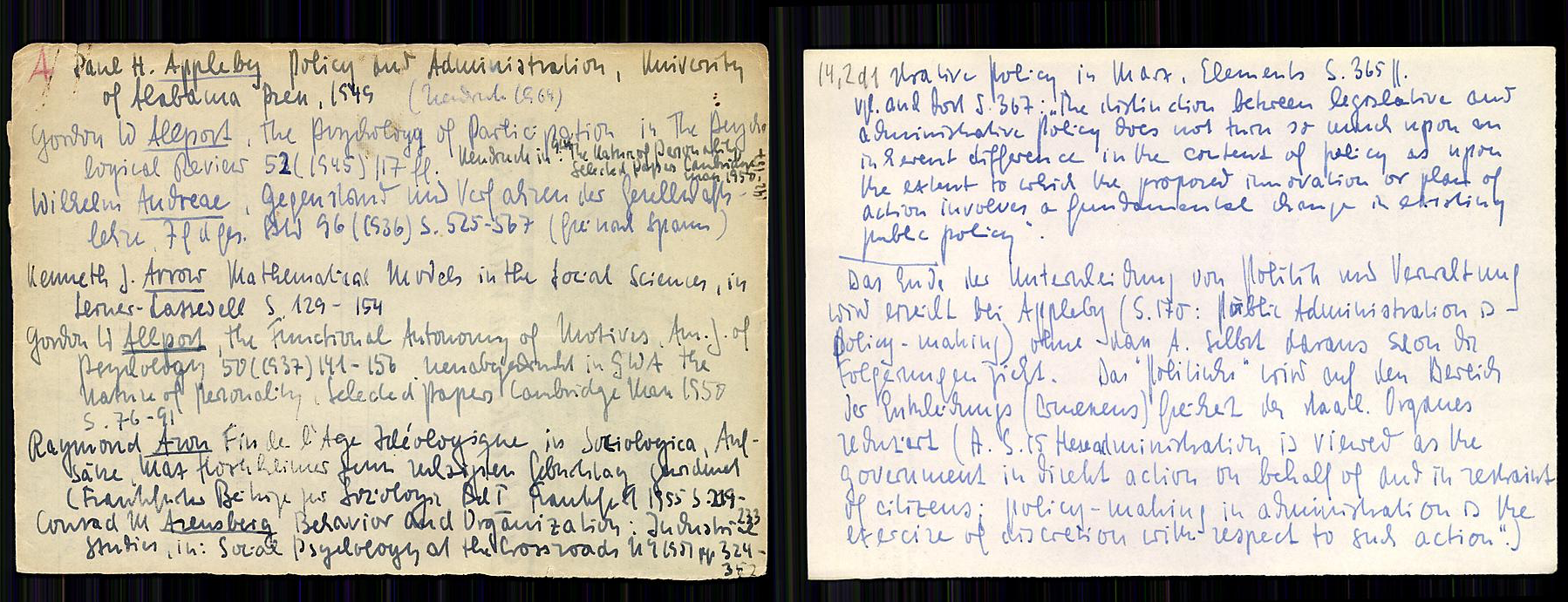 Таким образом, Луман выстраивал в своей картотеке последовательности карточек, которые развивали разные идеи и ветки размышлений. Из таких последовательностей заметок получались уже практически полностью готовые черновики для будущих статей или книг.