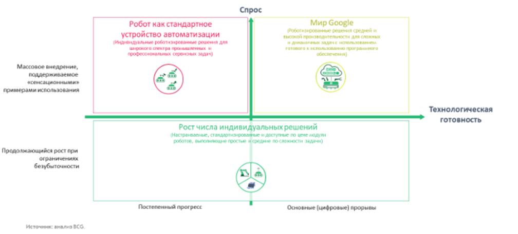 На этом рынке главную роль сыграет разработка программного обеспечения. Потенциально при развитии такого сценария компании, создающие роботов, сместятся на второй план. Они скорее превратятся в платформы для тестирования новых вариантов ПО.