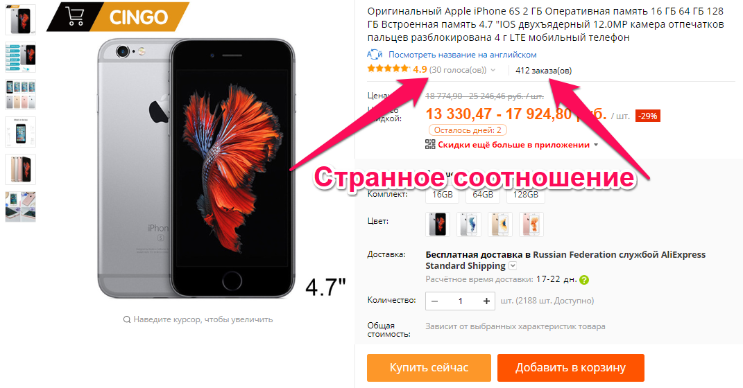 А вот в следующем примере соотношение заказов и отзывов странное — всего 30 отзывов при условии 412 заказов. И это при условии, что речь идет об iPhone 6s — товаре не самом дешевом, отзывов о которым в теории должно быть много. По меньшей мере подозрительно. Как выяснится во втором пункте, сомнения в отношении данного продавца появились не зря.