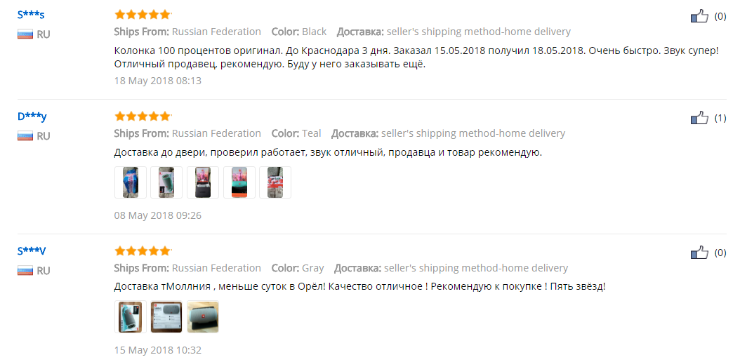 Беспроводная колонка с большим количеством заказов имеет настоящие отзывы. Покупатели относительно подробно описывают качество товара, условия доставки и другие связанные с покупкой моменты, а также прикладывают фотографии.