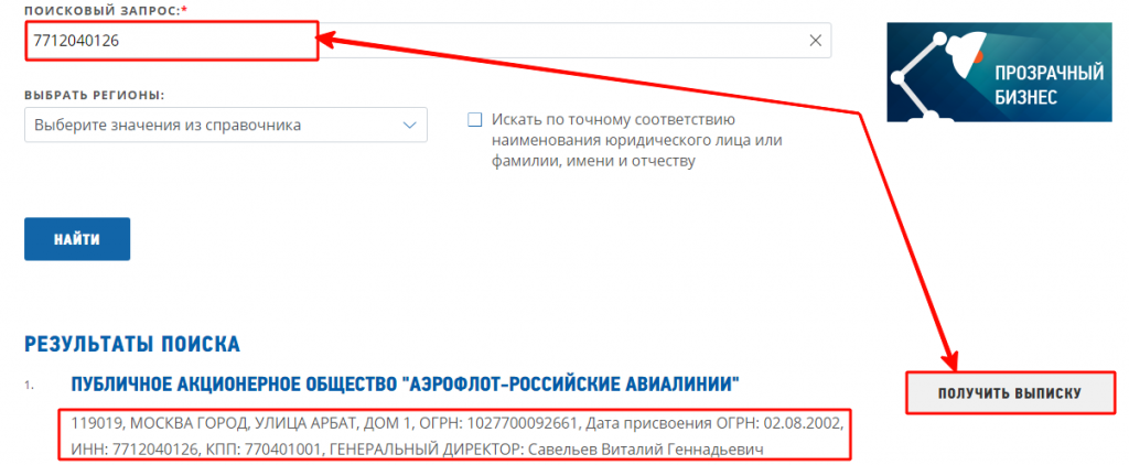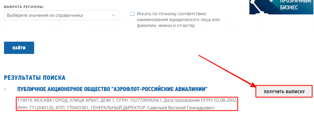 Ниже появится список с результатом поиска. С правой стороны от общей информации об искомой организации нажмите на кнопку “Получить выписку”.