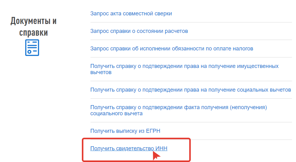 - В списке открывшихся услуг выберите «Получить свидетельство ИНН».