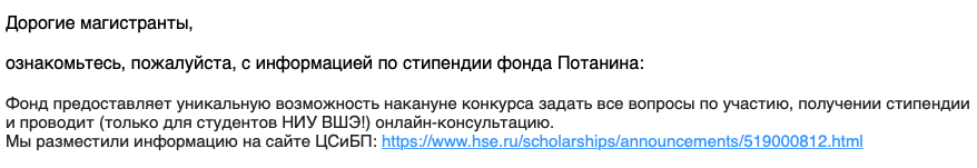 Письмо-приглашение на онлайн-консультацию для возможных участников конкурса на стипендию Потанина, ссылка на сайт Вышки