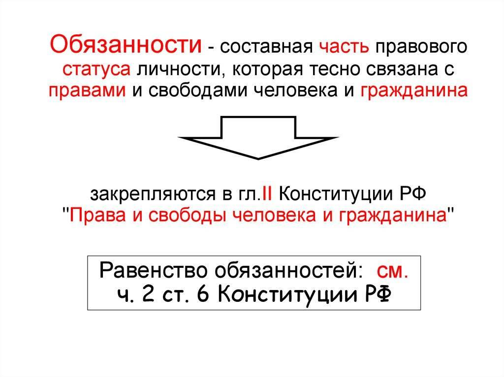Обязательным условием воплощения в жизнь гарантированных законом правомочий выступают конституционные обязанности, возложенные не только на россиян, но и на всех неграждан, находящихся на территории РФ. Совокупность таких обязательств перед государством определяется нормами законодательства. При этом конституционные обязанности каждого субъекта представляют собой гораздо более ограниченный круг обязательств, нежели все те, что предусмотрены законодательством в целом.
