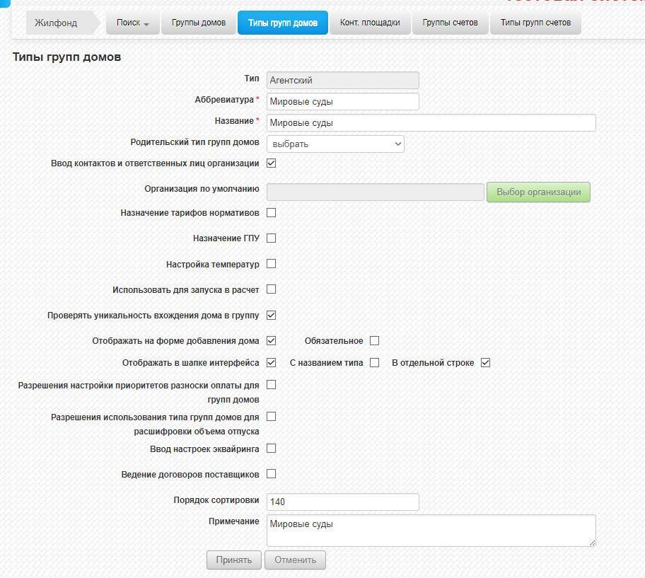 - Перейдите в раздел «Жилфонд» → Типы групп домов → нажмите кнопку → заполните параметры → нажмите кнопку «Принять».