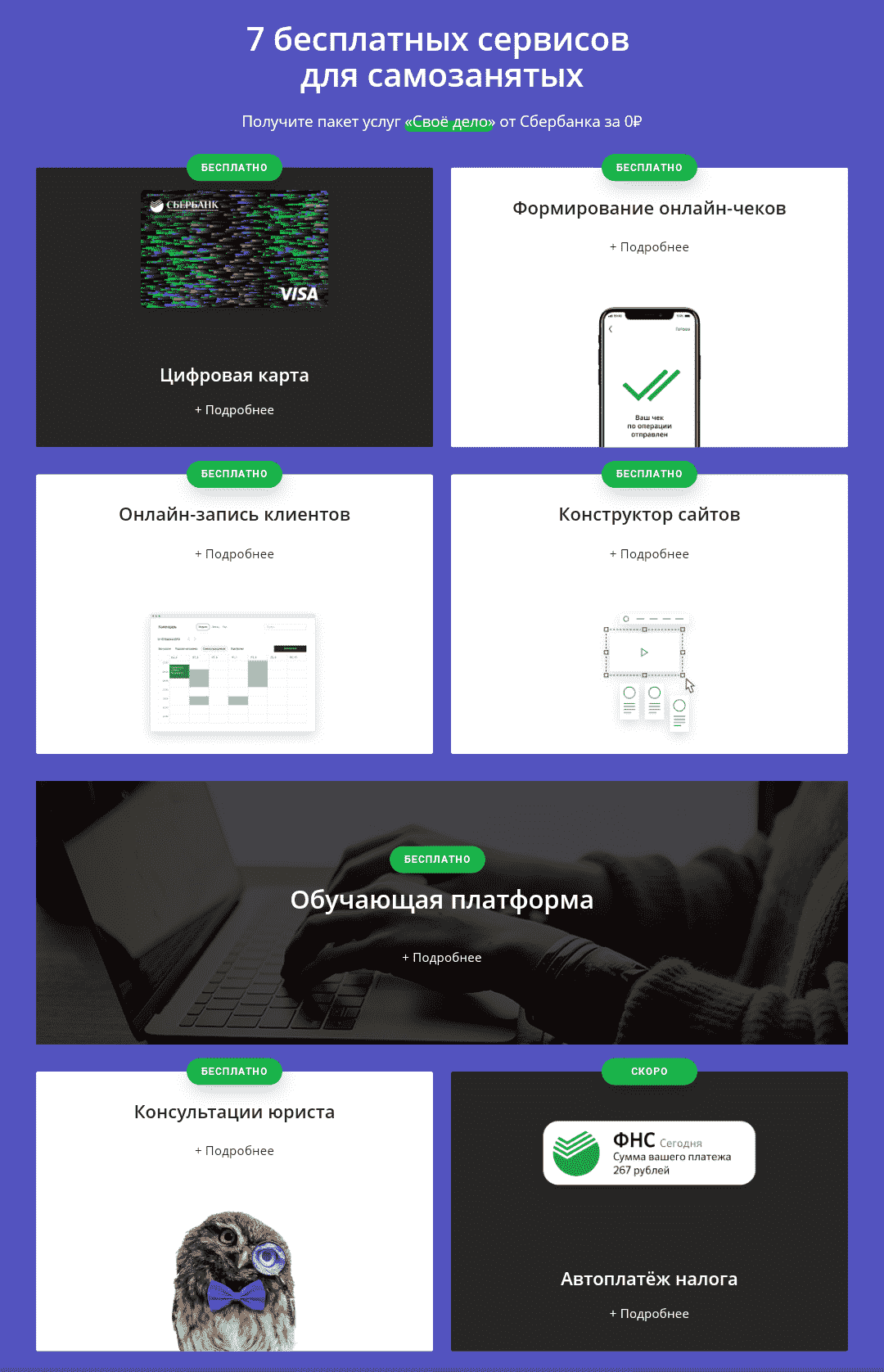 «Свое дело» – пакет из 7-ми сервисов, которые максимально упростят ведение бизнеса самозанятыми и сэкономят время на развитие, работу с постоянными клиентами и привлечение новых.