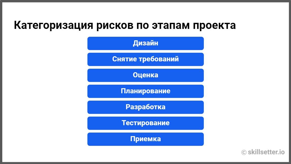 Например, типовой риск на стадии дизайна — заказчики не утвердили макет. После разработки может оказаться, что они по-другому их представляли. Тогда придется потратить время на внесение изменений, а для этого нужны дополнительные ресурсы.