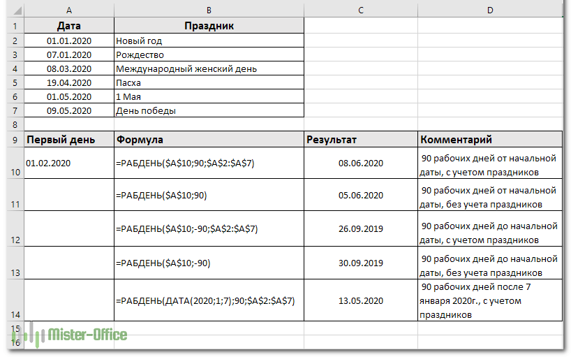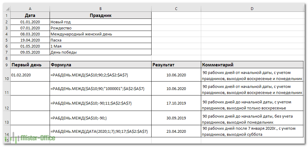 Предположим, у вас в ячейке A10 указан начальный момент времени, а список праздников — в ячейках А2: А7. Вы хотите узнать, какое число будет через 90 рабочих дней в будущем и прошлом.