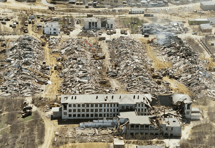 Ужасное землетрясение силой в 7,6 баллов, произошедшее 28 мая 1995 года, за 17 секунд превратило процветающий поселок в руины. Блочные пятиэтажки, школа, клуб и все здания рухнули, под обломками погибло более двух тысяч жителей. Спасатели боролись за жизни уцелевших людей день и ночь.