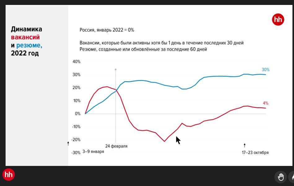 С начала СВО в феврале 2022 года рынок труда к сентябрю также восстановился и даже вырос. В октябре-ноябре также наблюдается рост числа вакансий. Но причина роста — призыв сотрудников, хотя в масштабах всей страны его показатель составил всего на 4-5% от уровня , что не критично для экономики. Женщин стали приглашать на работу больше, но это также влияние того, что мужчины стали менее доступны. В частности, больше женщин работодатели стали нанимать в традиционно мужских отраслях — транспорт и логистика, добыча, строительство.