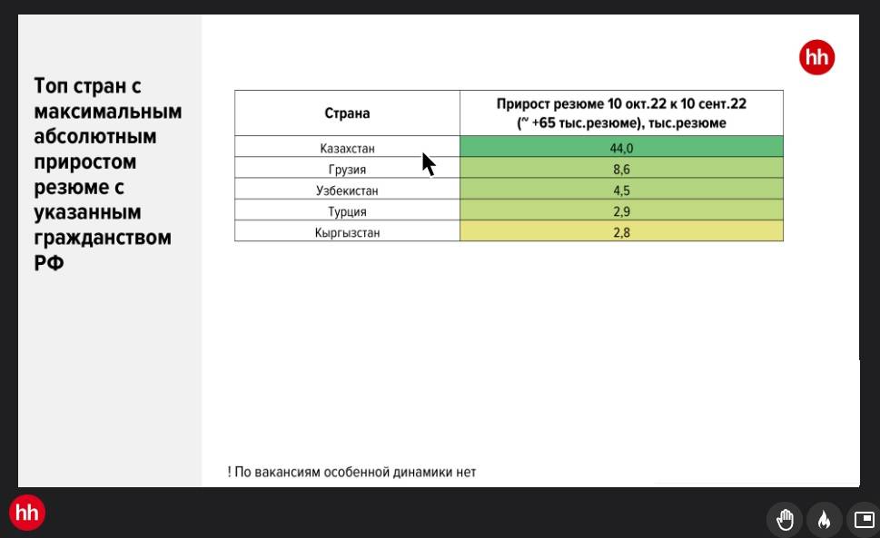 Из российских граждан уехавшие — это практически все белые воротнички, те, кто может работать удаленно. Их синих воротничков уехавшие — это, в основном, мигранты, которые уехали в свои страны. Среди уехавших много специалистов сферы IT, но их влияние на рынок труда оценить сложно, потому что смены работы у большинства не произошло: они продолжают работать у российских работодателей. Из женщин уехавшие это члены их семей. Много людей уехало из Москвы, Санкт-Петербурга и других крупных городов. В Москве и крупных городах краткосрочно наблюдалась нехватка даже офисного персонала.