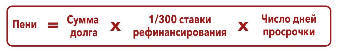 Пеня = сумма несвоевременно уплаченного платежа «х» количество дней просрочки «х» ставку рефинансирования «х» 1/300/