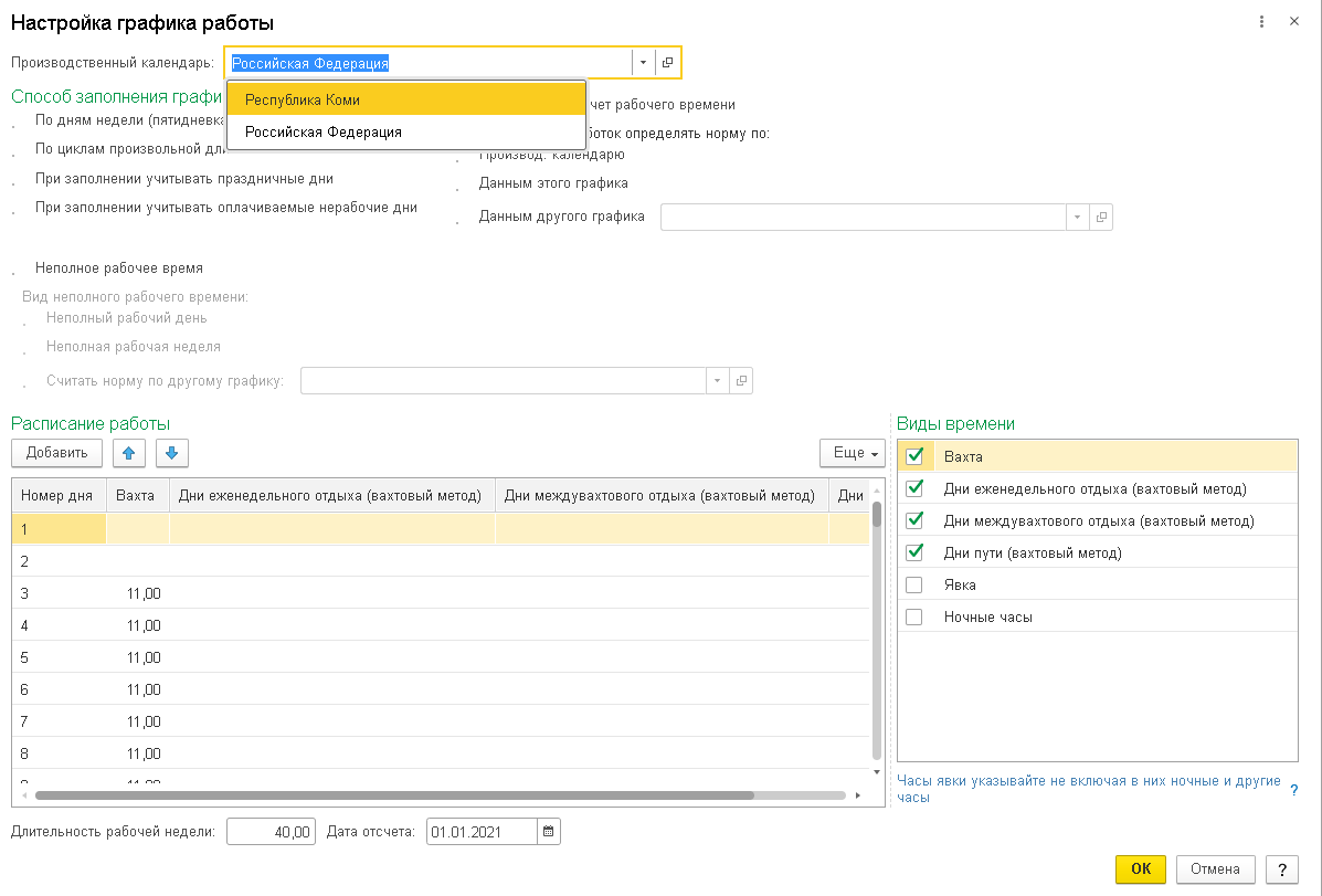 Становится доступным, если на предприятии предусмотрено несколько производственных календарей. Это может понадобиться для организаций, обособленные подразделения или филиалы которых расположены в регионах, имеющих собственные праздничные дни (для таких регионов норма дней не совпадает с общероссийским производственным календарем). Список производственных календарей хранится в справочнике «Производственные календари» (Настройка – Производственные календари). По умолчанию для всех графиков работы установлен производственный календарь с наименованием «Российская Федерация».