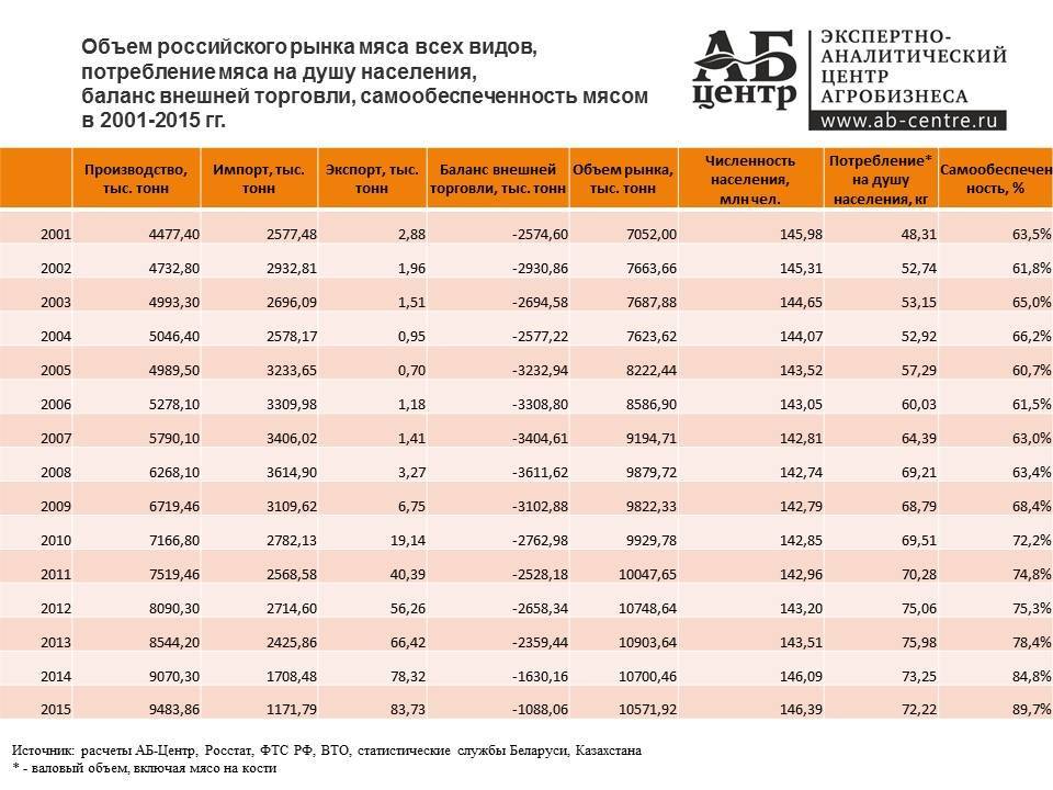 Импортозамещение по большинству видов сельскохозяйственных товаров в целом достигнуто. В 2015 году впервые превышен минимальный порог продовольственной независимости по мясу. Согласно Доктрине продовольственной безопасности РФ, самообеспеченность РФ мясом должна быть не менее 85%. В 2014 году самообеспеченность России мясом всех видов, по расчетам Экспертно-аналитического центра агробизнеса “АБ-Центр”, составила 84,8%, в 2015 году – достигла 89,7%. 10 лет назад показатели составляли 60,7%.